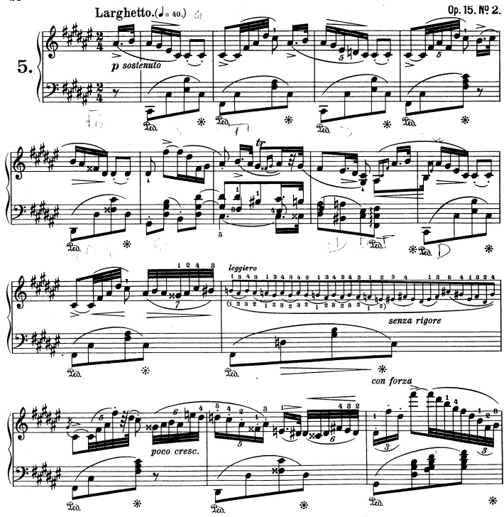 You will notice that this work uses a key that is not widely used: F sharp Major. You will also notice the use of an anacrusis, double sharp (measures 5,10,12), trills (measure 7), sixteenth note quintuplets (measure 3), and sixteenth note septuplets (measure 10).