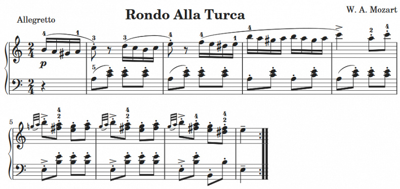 The Alla Turca rondo of Mozart's Piano Sonata N° 11 uses the 2/4 time signature: