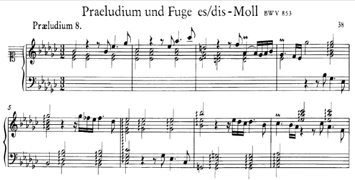 Prelude n°8 BWV 853 in E flat minor from book 1 of the well-tempered keyboard by Johann Sebastian BACH uses