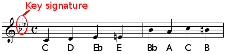 In this example (below), this key signature means that all E notes are E flat (E♭) and that all B notes are B flat (B♭). But the accidentals on measures (bars) affect the key signature: