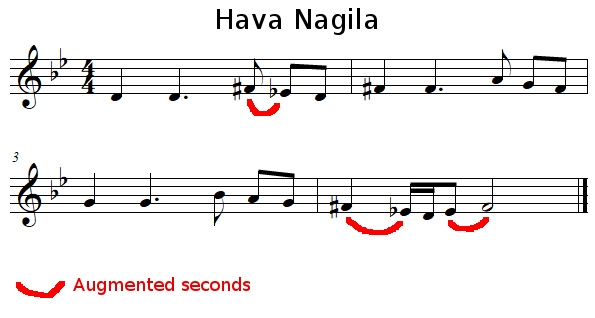 Hava Nagila is a Hebrew folk song that features a few augmented seconds: