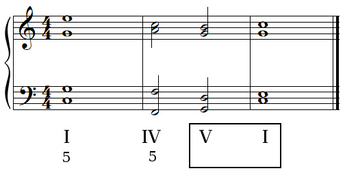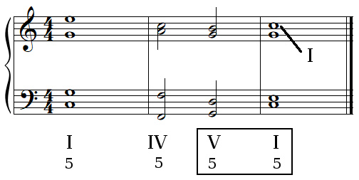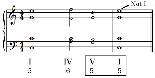A perfect authentic cadence is a cadence from V to I (dominant to tonic) with two other necessary conditions: Chords are in root position and the upper voice ends on degree I.