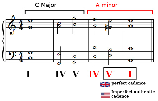 In this example, The beginning is in C Major and next (measure 3 and 4) we have some chords issued from the A minor key, and at the end of this score you will find an authentic cadence